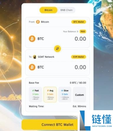 透过Goat 官方桥,可以将$BTC、$BTCB 和$DOGE 跨链到Goat Network,如下图分别连结BTC 和EVM 钱包,输入金额即可跨链,需等待1~2 小时到帐。