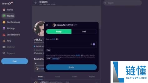 MemeX 创建后的页面就如同X 一般,用户可以在平台中多互动、发布任何异想天开的Meme 创作,吸引越多的互动流量和支持者,就可以获得MemeX 提供的$M 空投活跃奖励,还能吸引其他人购买你创作的Meme 代币。