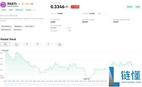 在近期价格表现方面,PARTI 目前的交易价格为 0.3344 美元,反映 24 小时变化为 -9.42%。该代币的历史最高价为 0.3738 美元,表明未来存在复苏和增长的潜力。