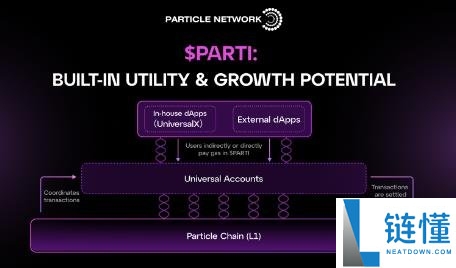Particle 链,由 PARTI 提供经济支持。Particle 链协调通用账户在所有链上的活动,因此是整个生态系统的链抽象的支柱。通用账户 (UA),为用户提供一个账户、一个余额、任何链的体验。PARTI 充当 UA 和 Particle 链之间的关键链接,结算所有交易并捕获链抽象生态系统创造的价值。PARTI 驱动 Particle 链上的所有结算,被每个 UA 交易消耗(用户无需持有)。利用通用账户的 dApp 生态系统。这最初将涉及由 Particle Network 开发的应用程序(如 UniversalX),并将发展到包含任何 dApp。在这里,PARTI 再次发挥关键作用,因为该代币的内置实用性自然会随着通用账户生态系统的增长而产生对其的需求。