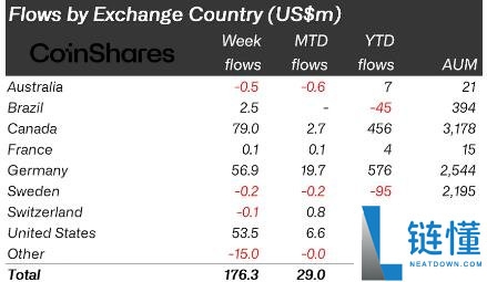 在各地区ETP 的投资情况方面,加拿大和德国持续呈现净流入,金额分别为7,900 万美元和5,690 万美元,美国净流入额为5,350 万美元,与前一周相比有所提升。香港则出现1,500 万美元的小幅净流出,虽然亚洲地区的AuM 较小,ETP 数量仍很少,但亚洲是年初至今少数出现净流出的区域之一。