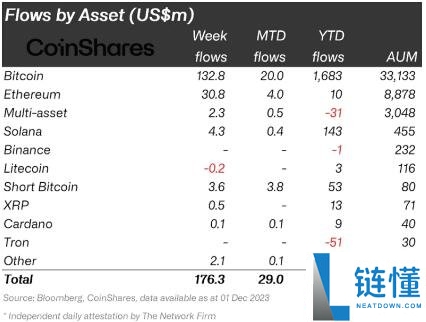 在各类币种投资产品方面,比特币占主导地位,净流入金额高达1.328 亿美元,但同时,上周做空比特币投资产品在经历连续三周净流出后出现360 万美元的净流入。