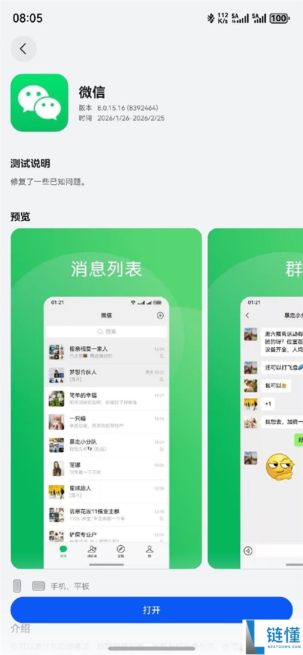 1月27日消息,鸿蒙版微信开启邀请测试8 0 15 16(8392464)版本,测试时间为 2026 1 26-2026 2 25,灰度更新支持了蓝牙手表微信。用户通过扫