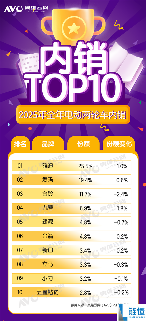 2025年电动自行车销量TOP10出炉:雅迪夺冠、独有超1/