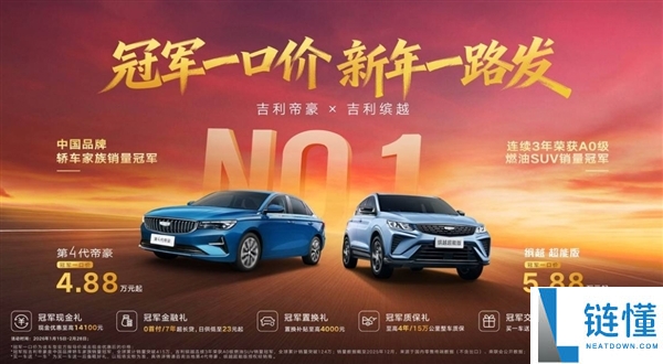 1月15日消息,近日,吉利针对第四代帝豪与缤越超能版推出冠军一口价新年限时活动,售价