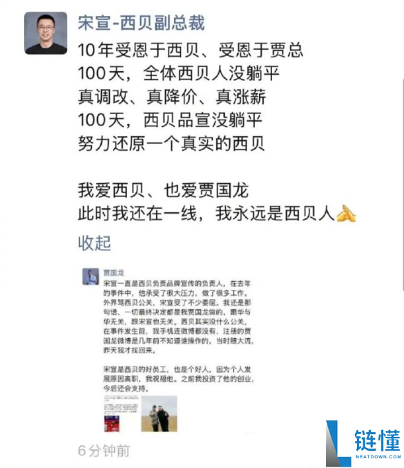 1月16日消息,西贝闭店再次引发全网热议,有传闻称,西贝公关副总裁宋宣已离职。今日,宋宣发朋友圈回应离职消息。他表示,10年受恩于西贝