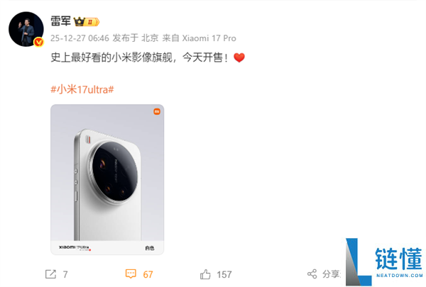 12月27日消息,今天早上不到7点,小米创办人,董事长兼CEO雷军就发文表示:史上最好看的小米影像旗舰,今天开售。小米17 Ultra在外观设计