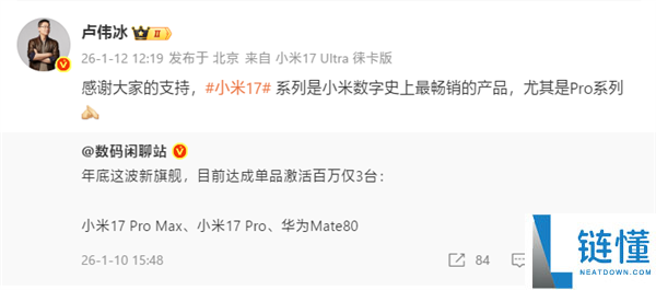 1月12日消息,据博主数码闲聊站透露,年底这一波新旗舰中,目前达成单品激活百万仅3台:小米17 Pro Max、小米17 Pro、华为Mate 80。其