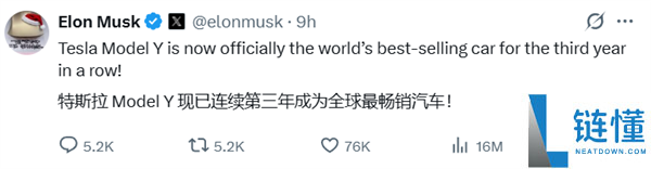 12月31日消息,马斯克在其社交平台上宣布:特斯拉Model Y已连续三年成为全球最畅销的汽车。中国和美国作为特斯拉最大的两个市场,Model Y
