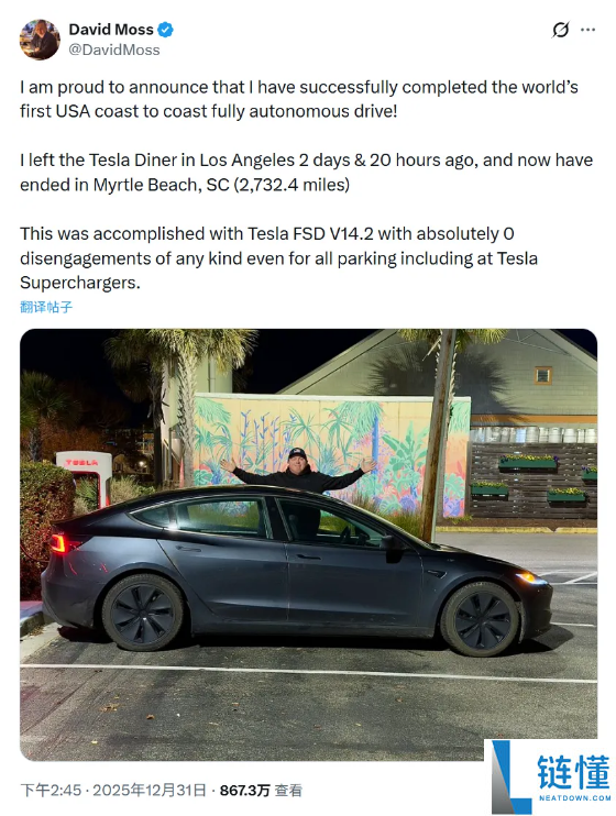1月1日消息,据报道,特斯拉车主大卫·摩斯(David Moss)完成了一项极具象征意义的挑战:他坐在自己的Model 3中,全程未进行任何干预,