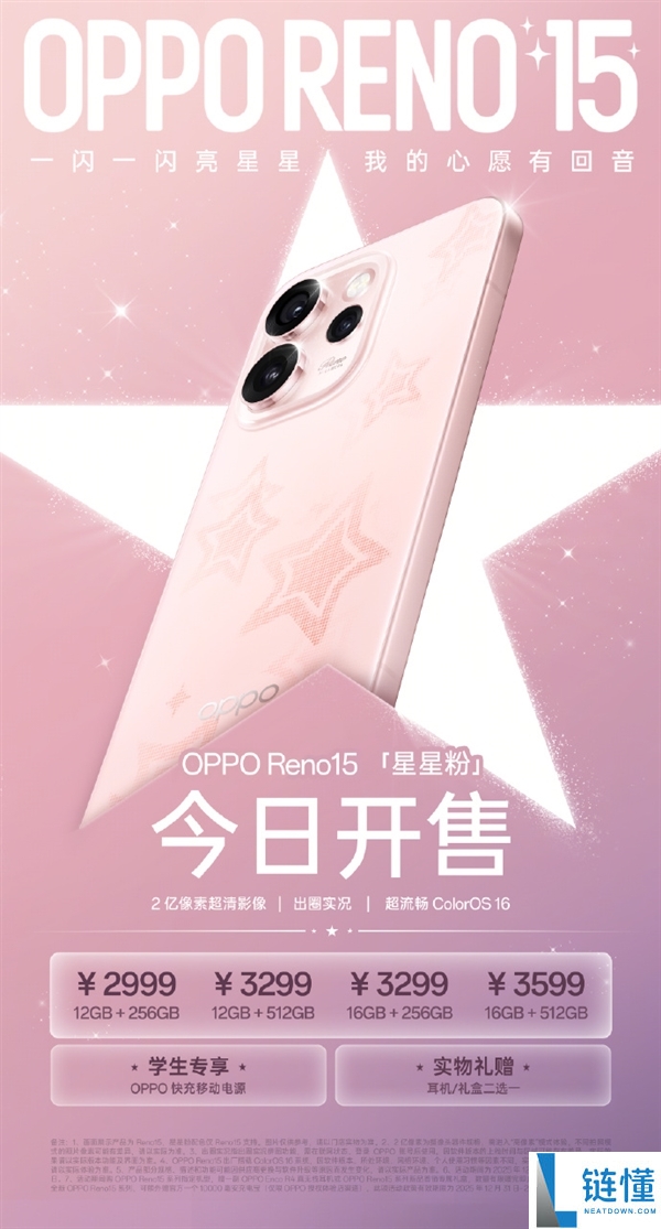 2999元起 OPPO Reno15新配色星星粉开售 行业首发星闪光栅工艺