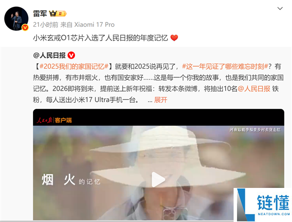 12月30日消息,很快2025年就要过去了,近日《人民日报》汇总了过去1年我们家国记忆,其中小米自研芯片也顺利入选。雷军本人也是在社交媒体