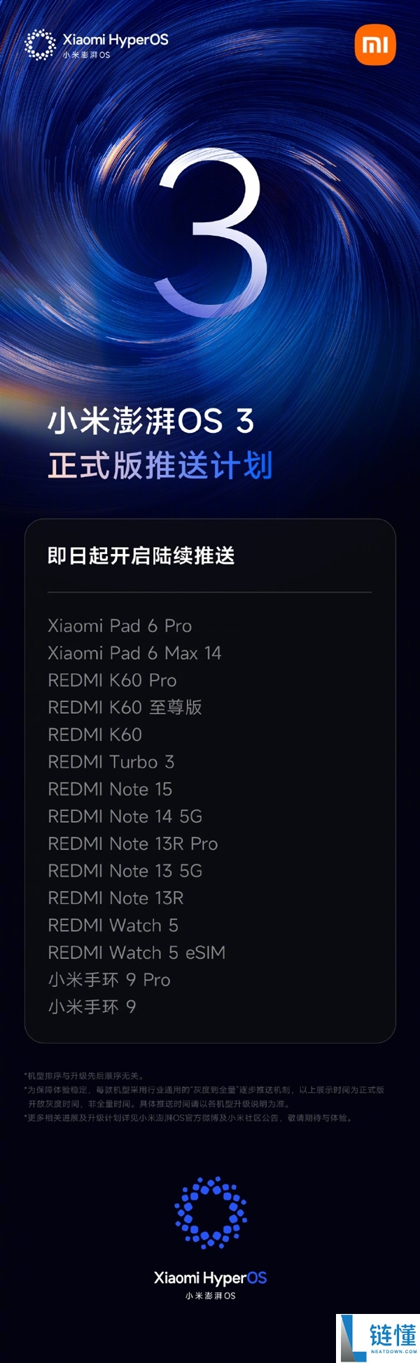小米磅礴OS 3正式版公布掩盖更多机型:REDMI K60等15款装备在列