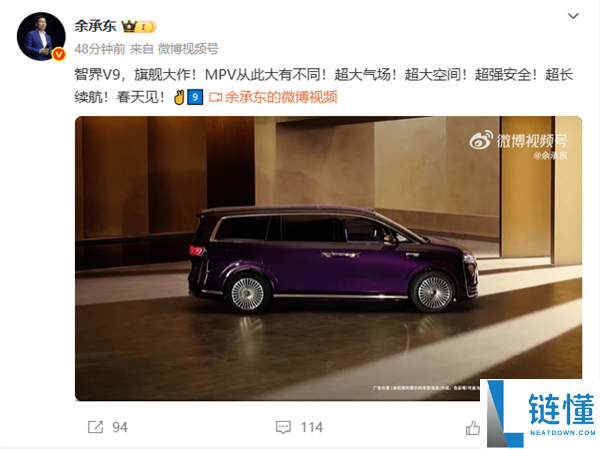 鸿蒙智行首款MPV,余承东:“旗舰大作”智界V9本年春季见